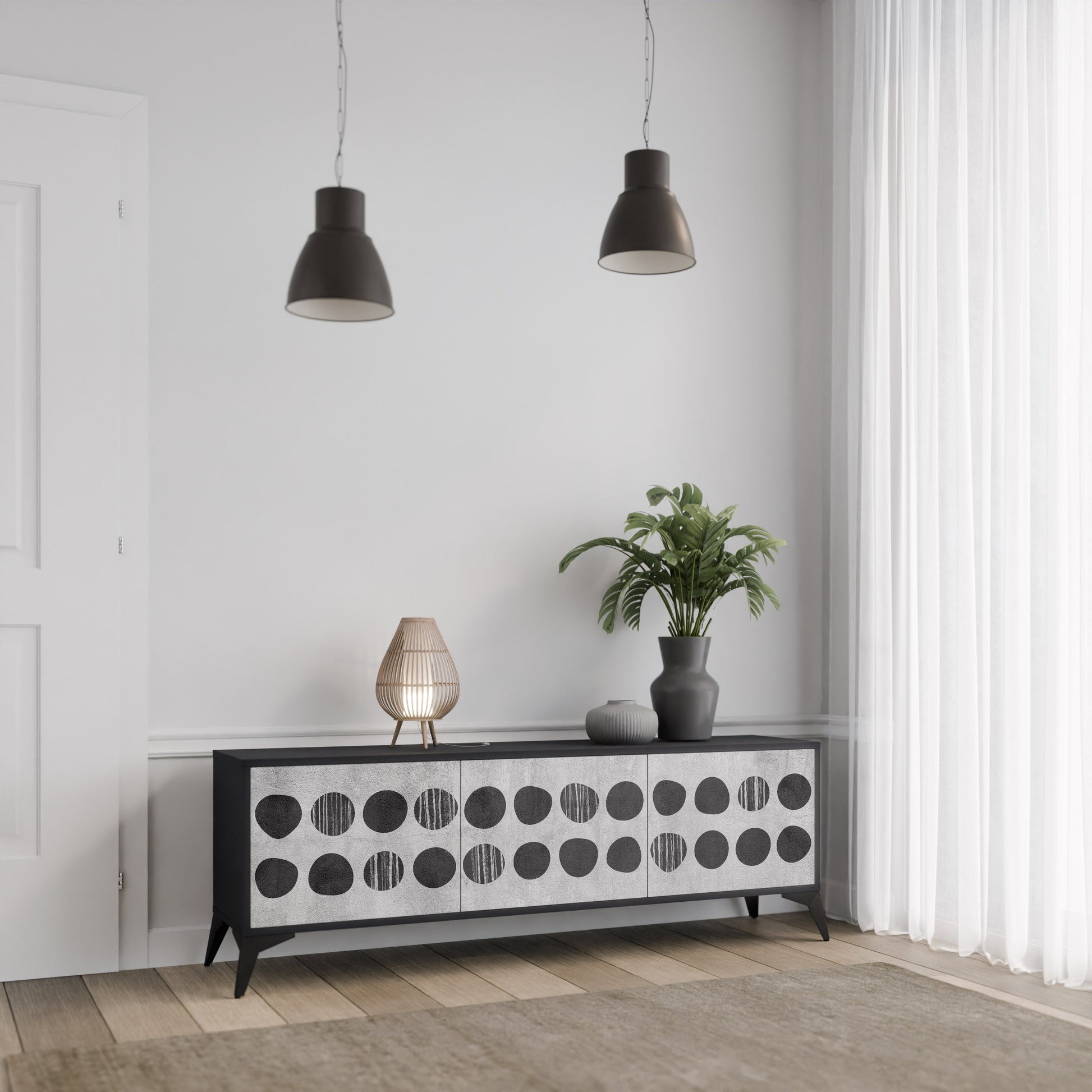 Il corpo nero del mobile crea un accento deciso e contemporaneo, che si abbina alla perfezione agli ambienti in stile industriale e minimalista. I frontali con stampa dal design ricercato aggiungono carattere e unicità, rendendo questo mobile non solo pratico, ma anche un forte elemento decorativo.