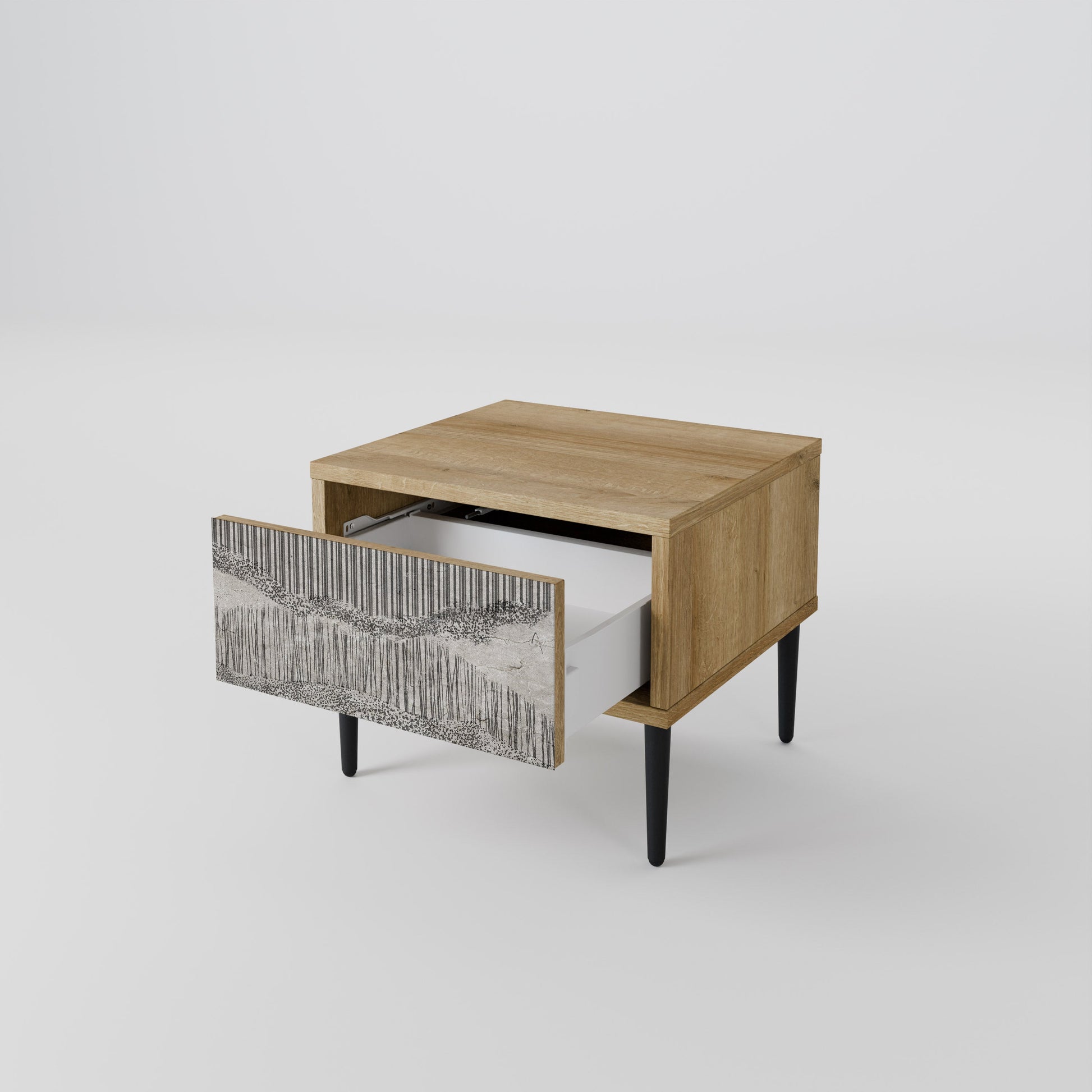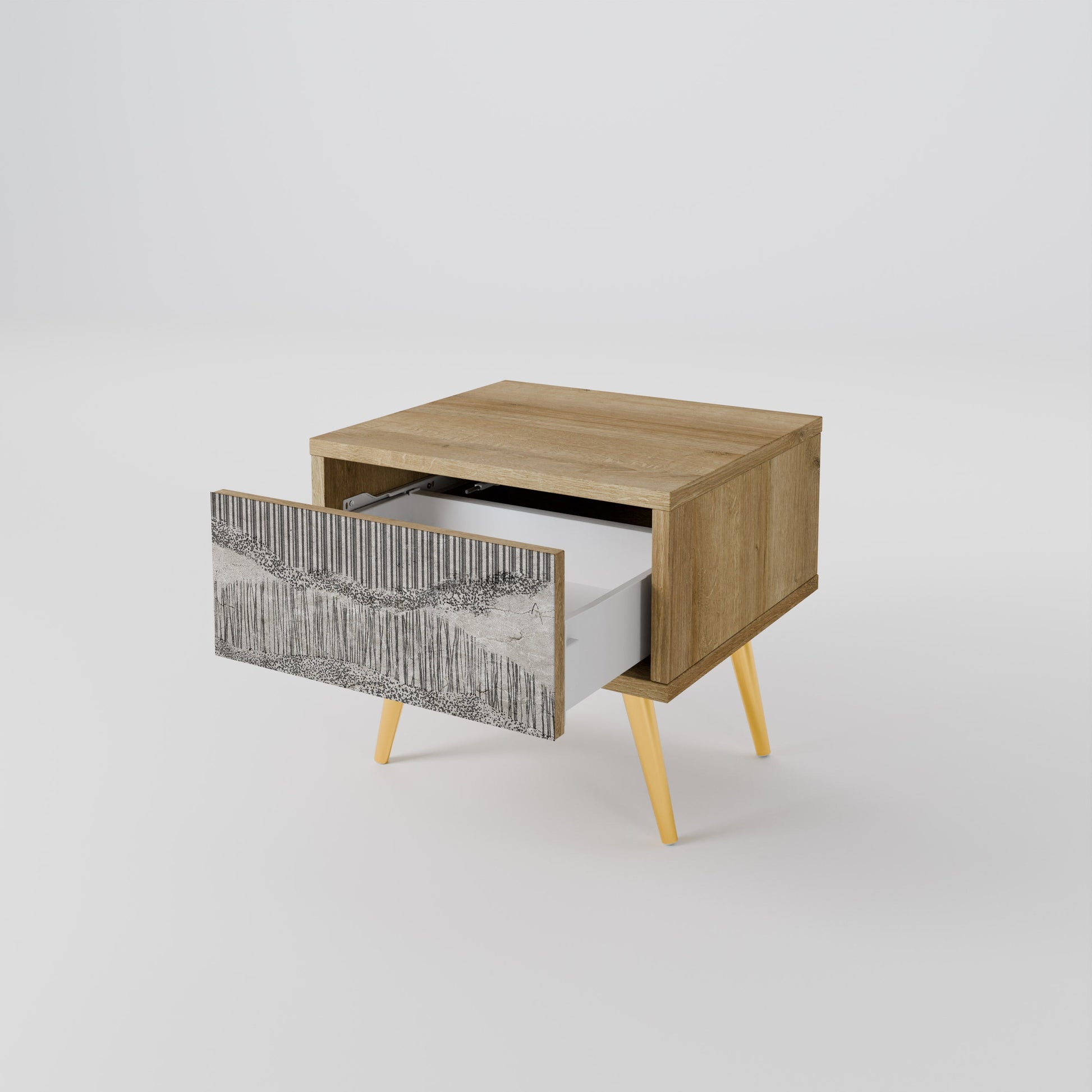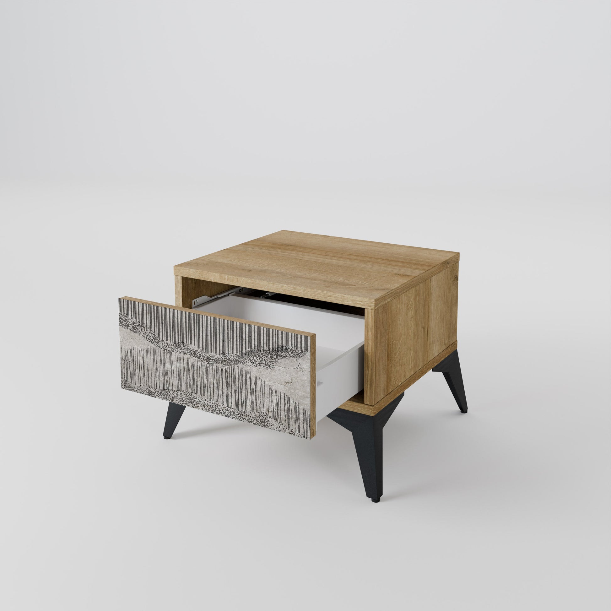 Scopri funzionalità ed eleganza in un formato compatto con il nostro comodino con cassetto. Questo elemento d’arredo pratico e di stile combina perfettamente la bellezza naturale del legno con un design moderno sul frontale del cassetto, creando un dettaglio armonioso per qualsiasi camera da letto.