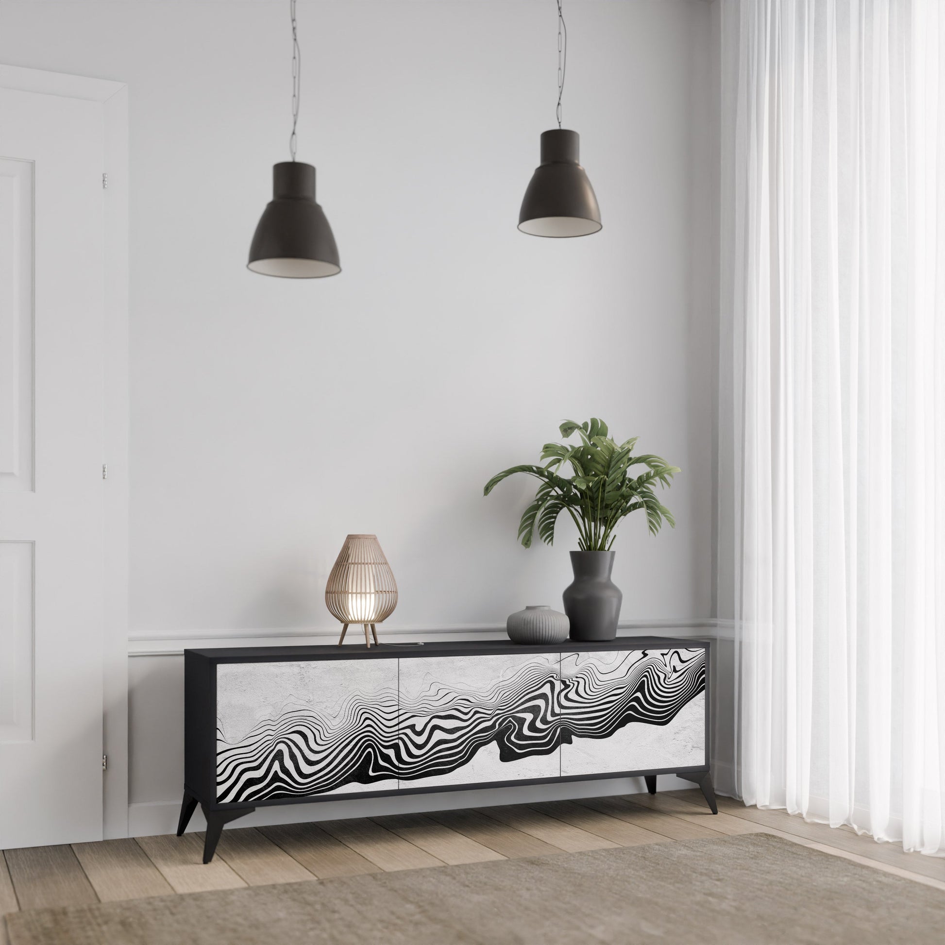 Il corpo nero del mobile crea un accento deciso e contemporaneo, che si abbina alla perfezione agli ambienti in stile industriale e minimalista. I frontali con stampa dal design ricercato aggiungono carattere e unicità, rendendo questo mobile non solo pratico, ma anche un forte elemento decorativo.