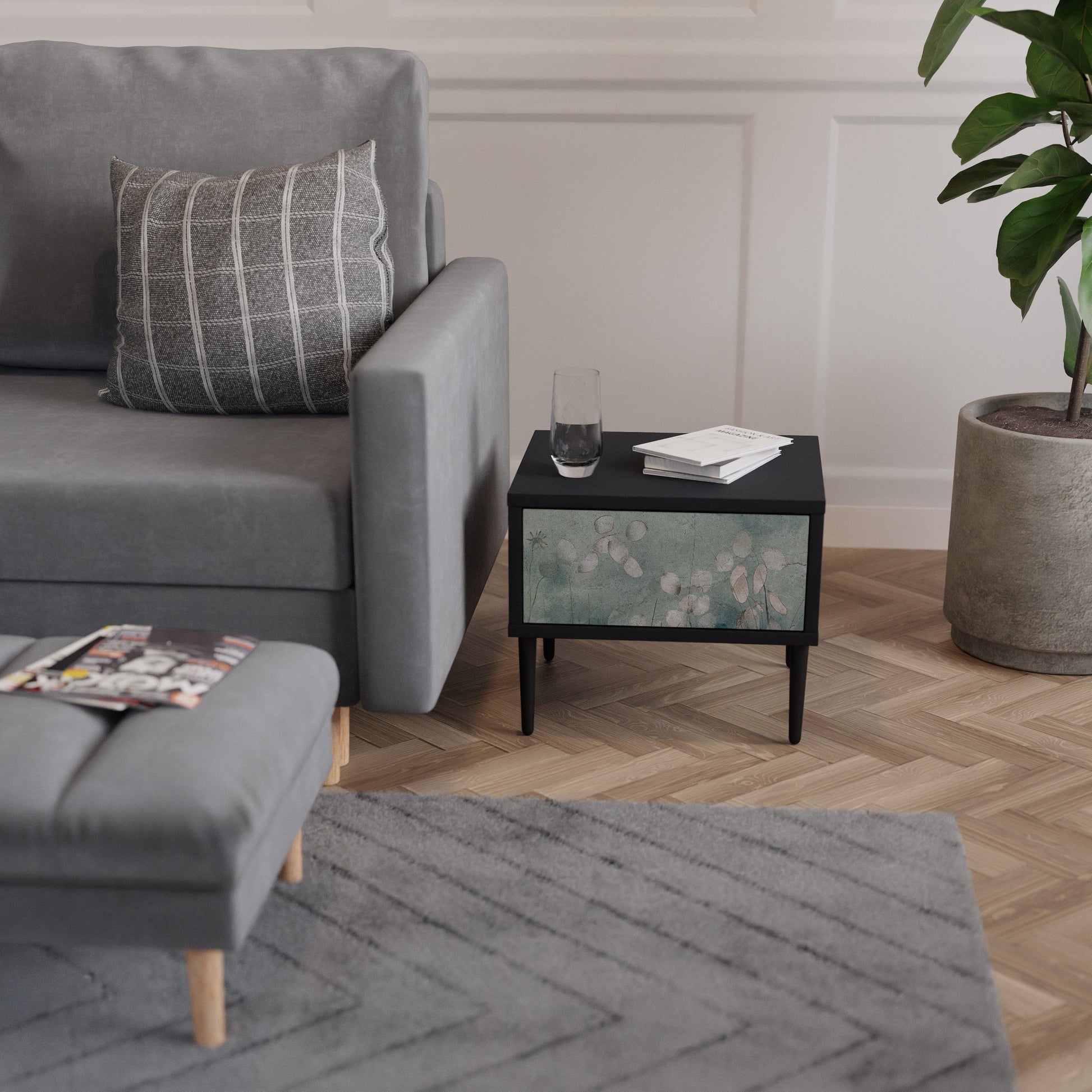 Scopri raffinatezza e praticità in un formato compatto con il nostro comodino con cassetto in elegante finitura nera. Questo elemento d’arredo funzionale e sofisticato unisce uno stile contemporaneo a un design minimalista, diventando un dettaglio di grande impatto in qualsiasi camera da letto.