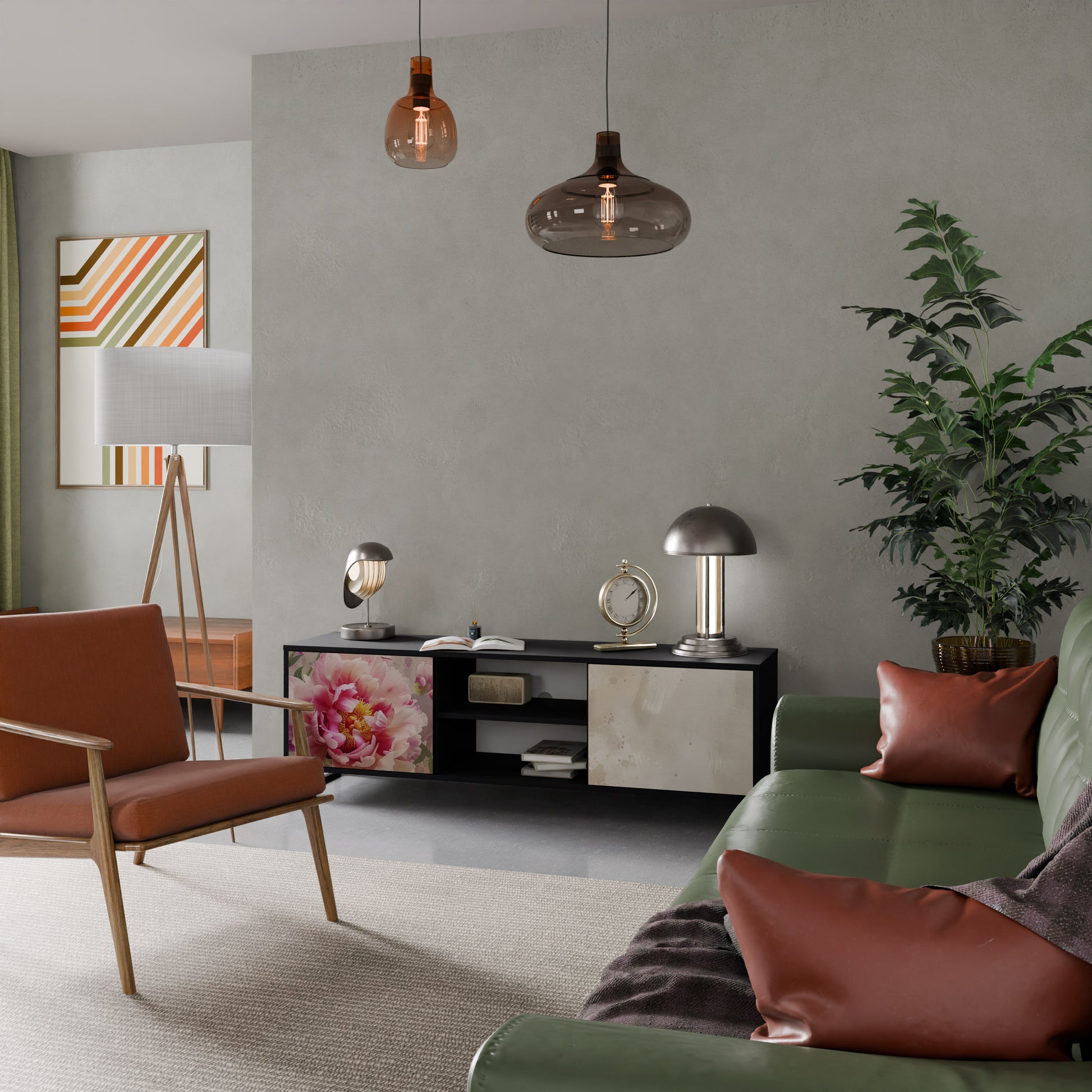 Il corpo nero conferisce al mobile un aspetto elegante e moderno, mentre i frontali con stampa decorativa d’effetto catturano lo sguardo e trasformano il mobile nel punto focale della stanza. L’ampio spazio interno permette di riporre dispositivi elettronici, cavi, telecomandi e altri accessori, aiutandoti a mantenere ordine e organizzazione.