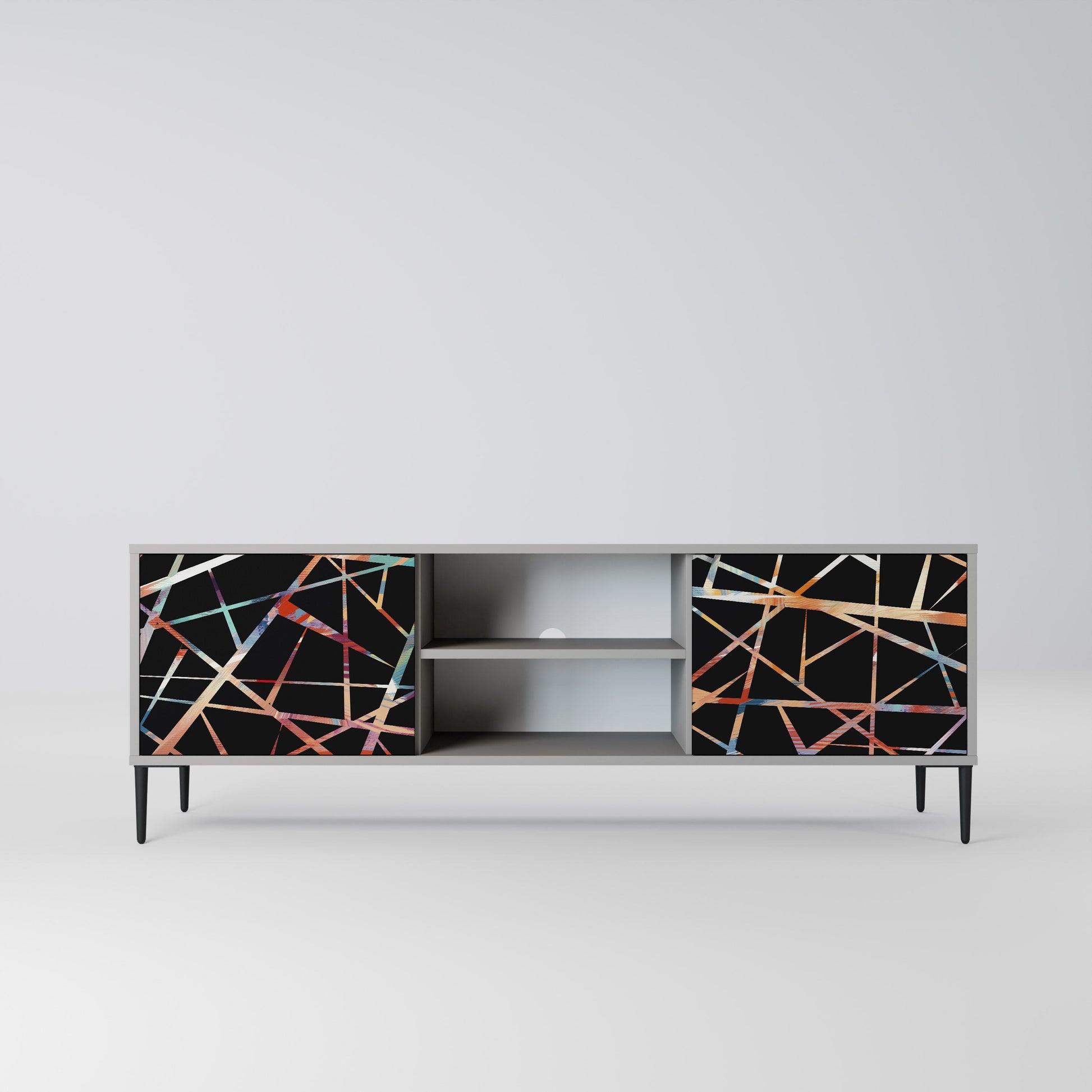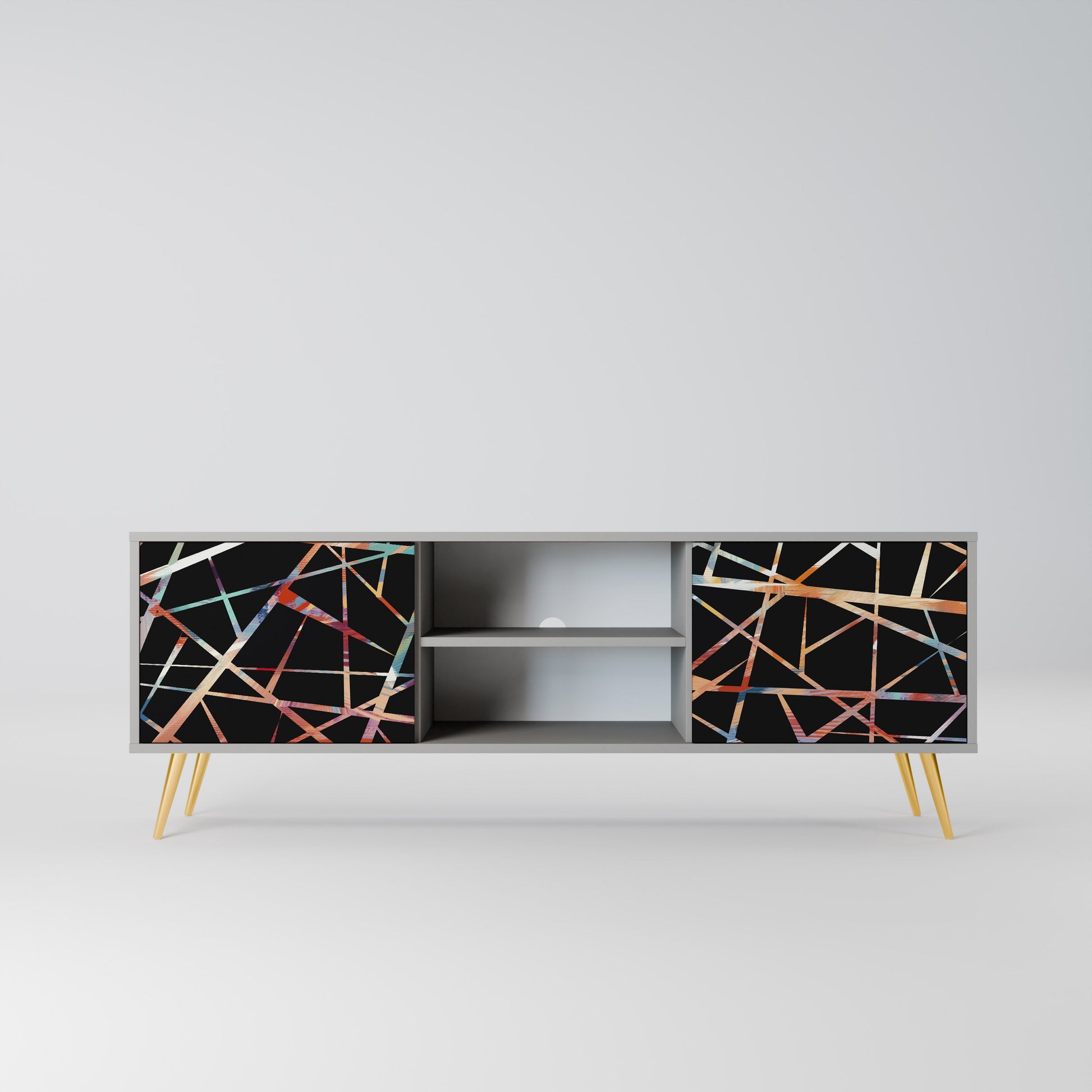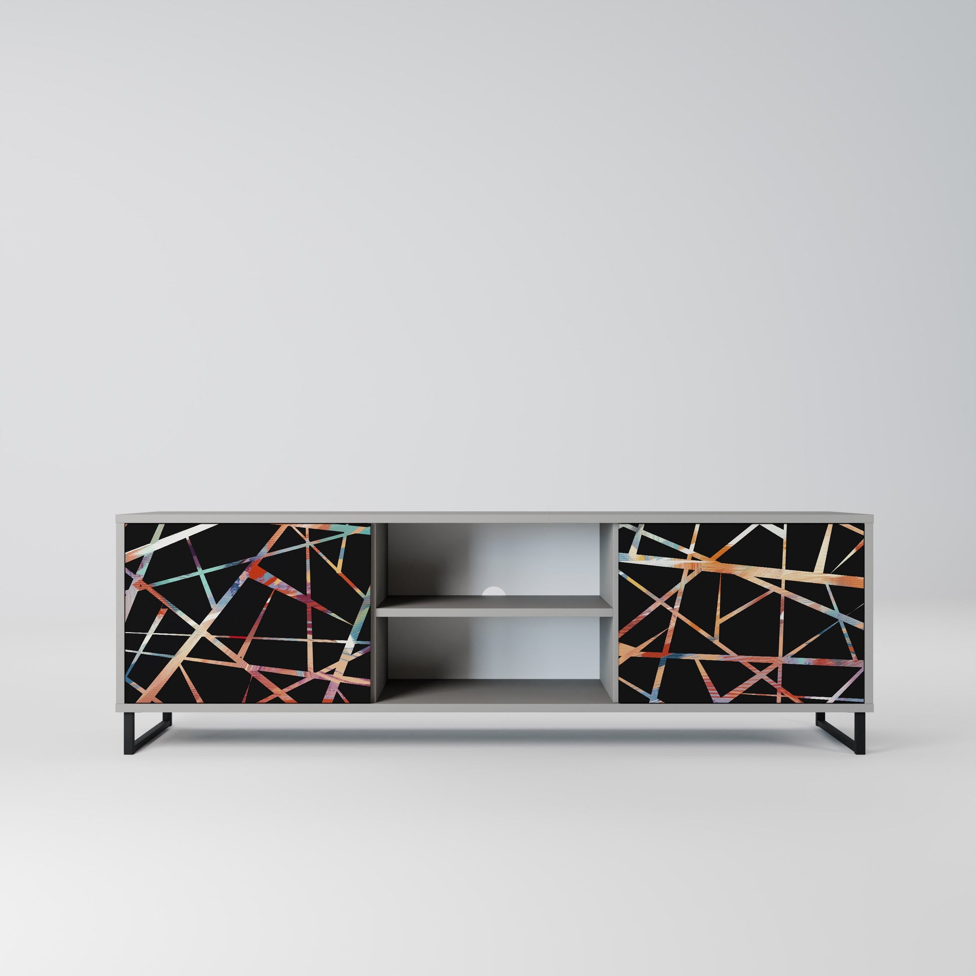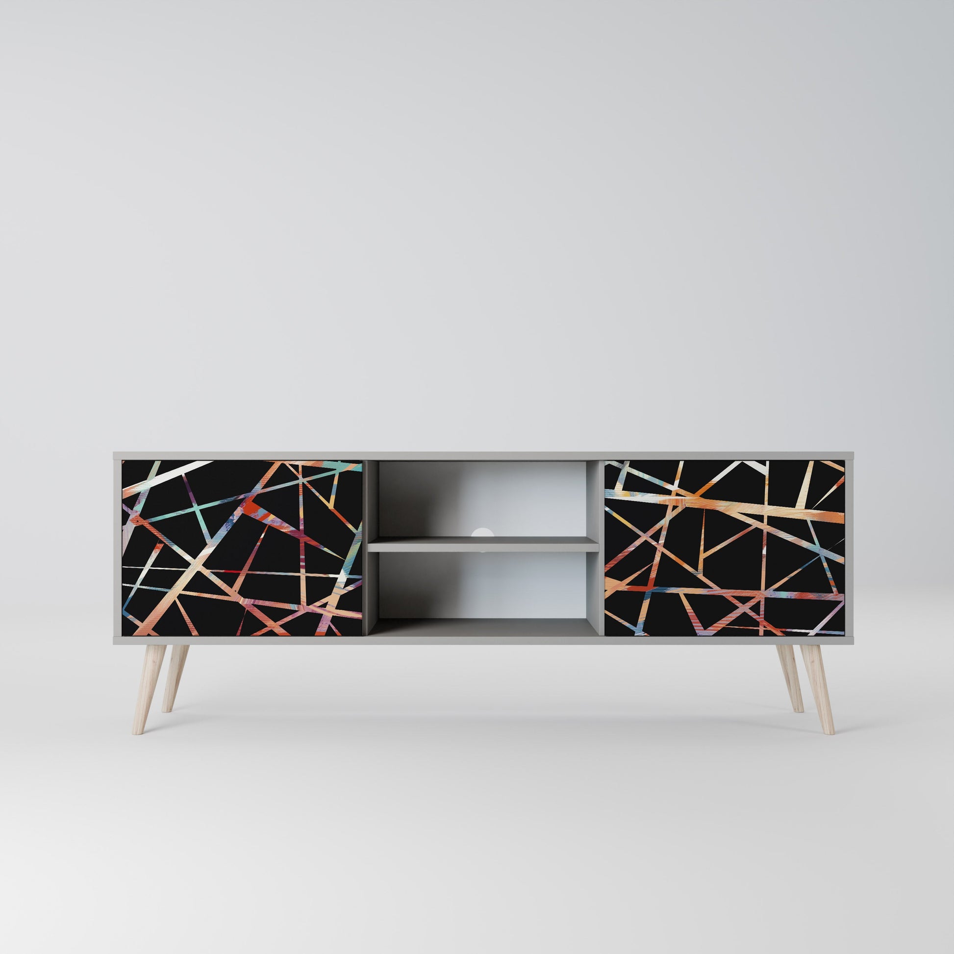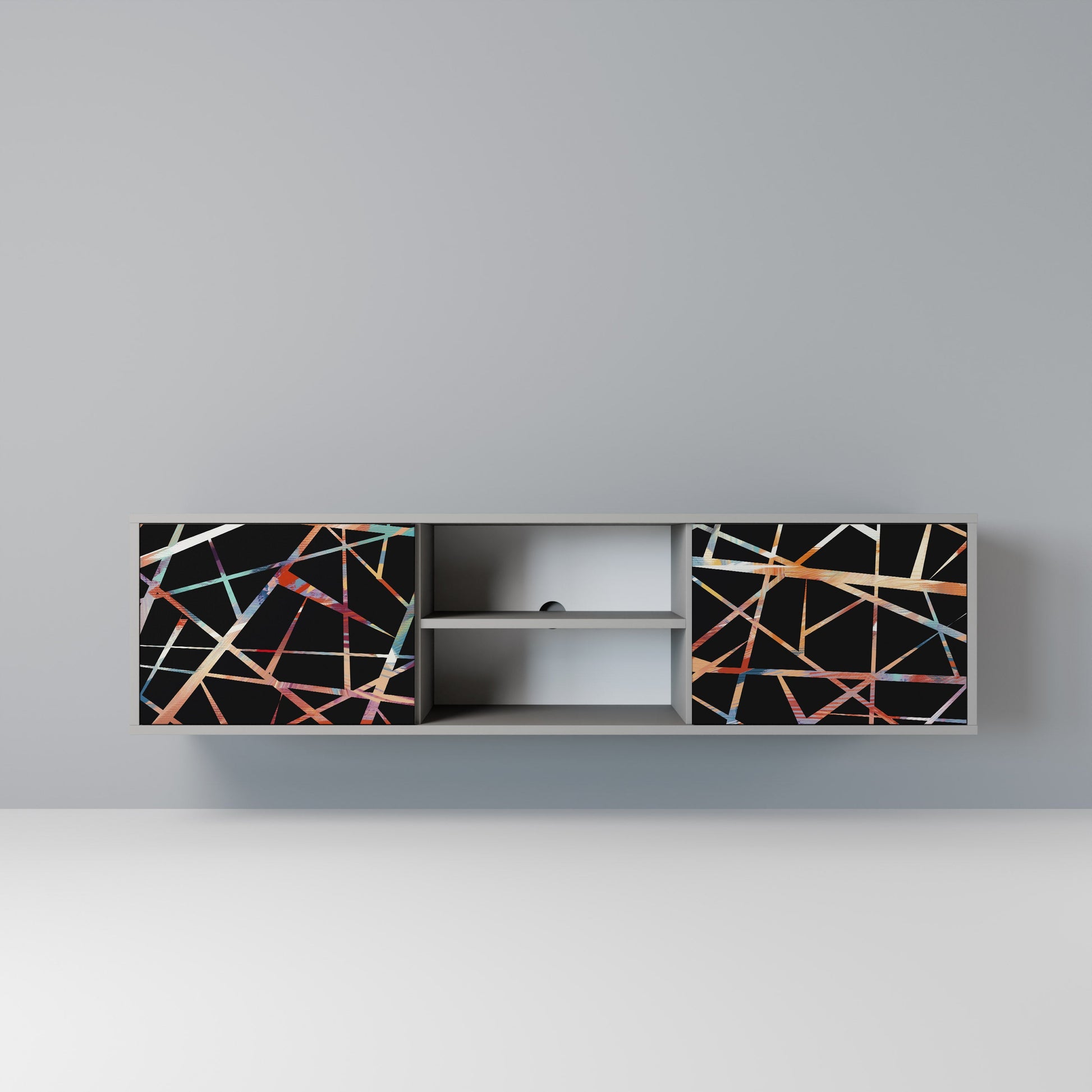 Il corpo grigio conferisce al mobile un aspetto contemporaneo e raffinato, mentre i frontali con stampa decorativa d’effetto catturano lo sguardo e trasformano il mobile nel punto focale della stanza. L’ampio spazio interno permette di riporre dispositivi elettronici, cavi, telecomandi e altri accessori, aiutandoti a mantenere ordine e organizzazione.