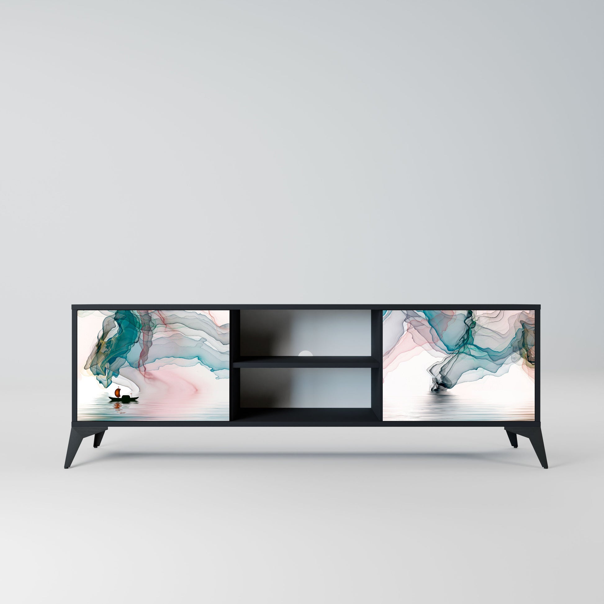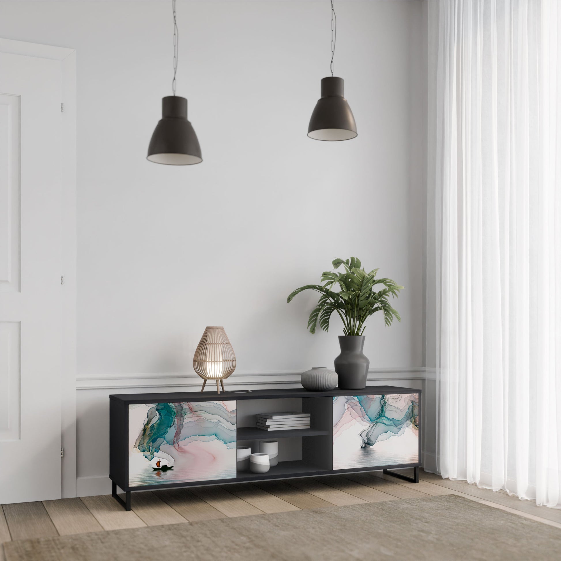 Il corpo nero conferisce al mobile un aspetto elegante e moderno, mentre i frontali con stampa decorativa d’effetto catturano lo sguardo e trasformano il mobile nel punto focale della stanza. L’ampio spazio interno permette di riporre dispositivi elettronici, cavi, telecomandi e altri accessori, aiutandoti a mantenere ordine e organizzazione.
