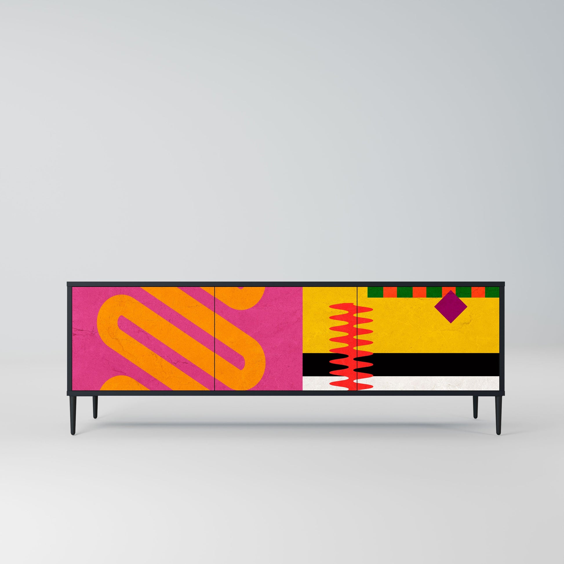 Scopri il perfetto equilibrio tra stile e funzionalità! Il nostro mobile TV a 3 ante con corpo nero porta eleganza moderna e il massimo spazio contenitivo nel tuo soggiorno. È la scelta ideale per la zona living, offrendo un piano per la TV e spazio dedicato a dispositivi elettronici, accessori e decorazioni.