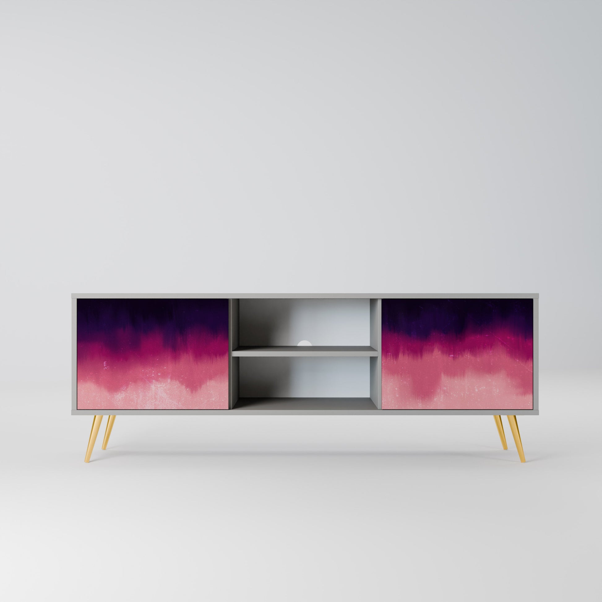 The grey body lends the TV stand a contemporary, refined look, while the fronts with an exceptional print capture attention, becoming the focal point of any room. The spacious interior provides room for electronic devices, cables, remotes, and other accessories, helping you maintain order and organization.