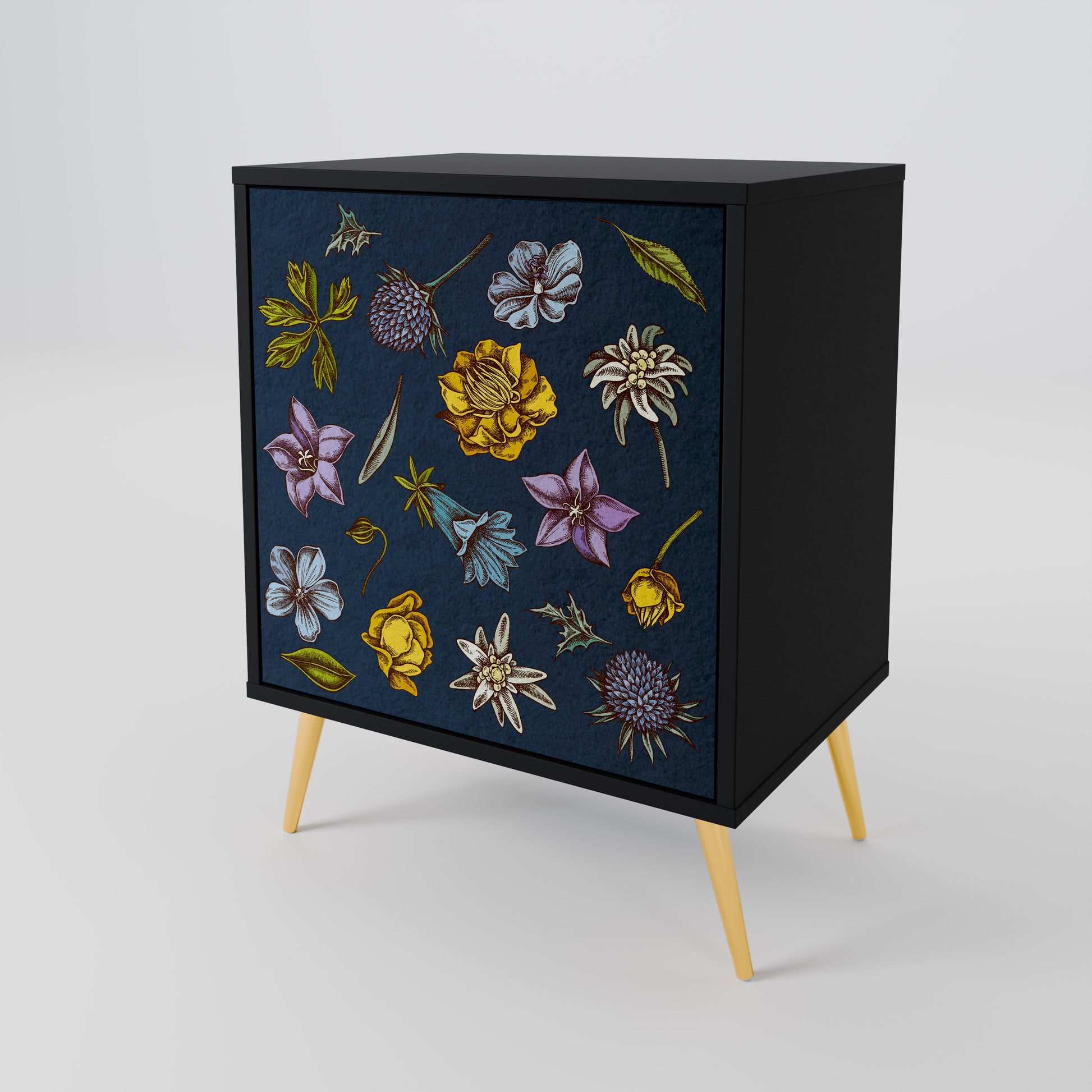 FLOWERS ON NAVY BLUE 1-Door Sideboard in Black Finish
