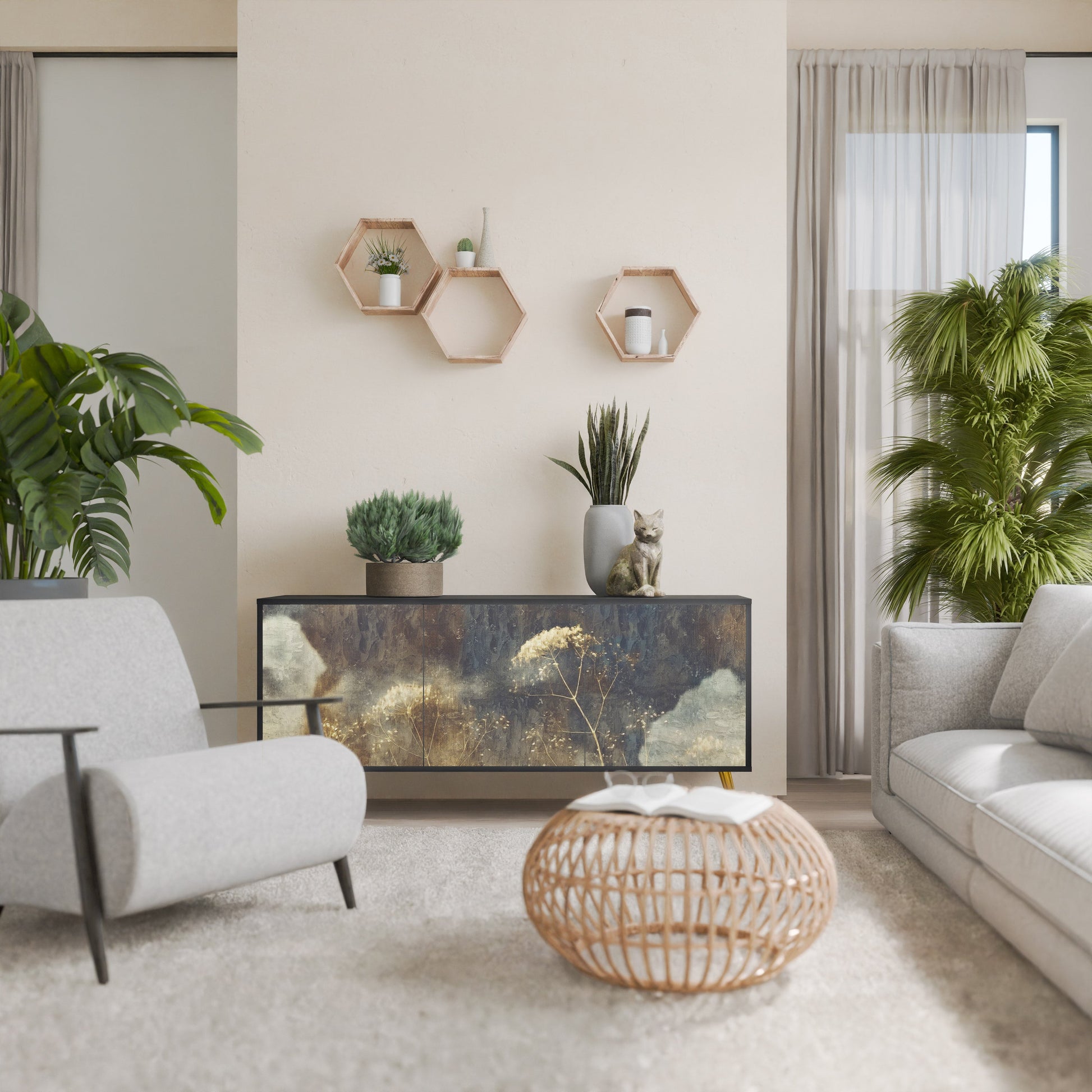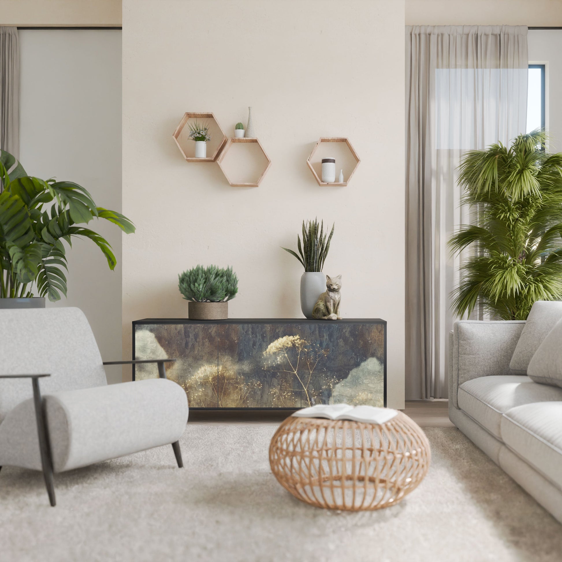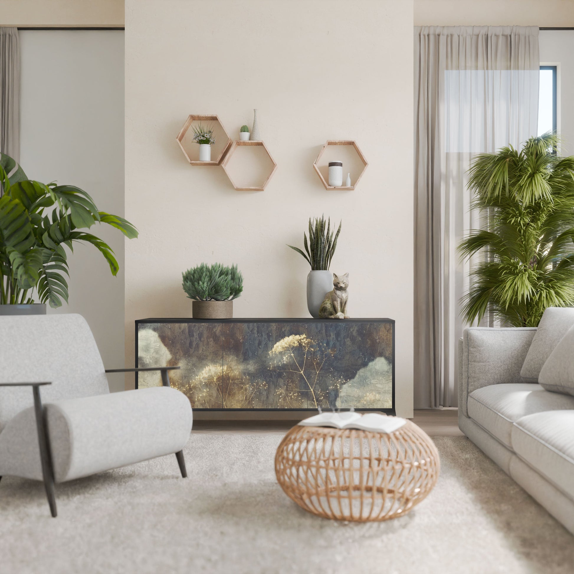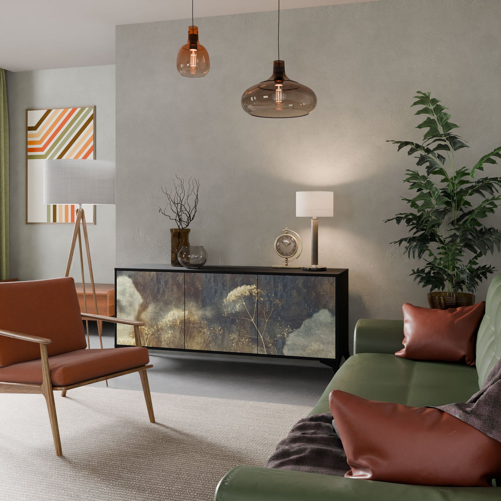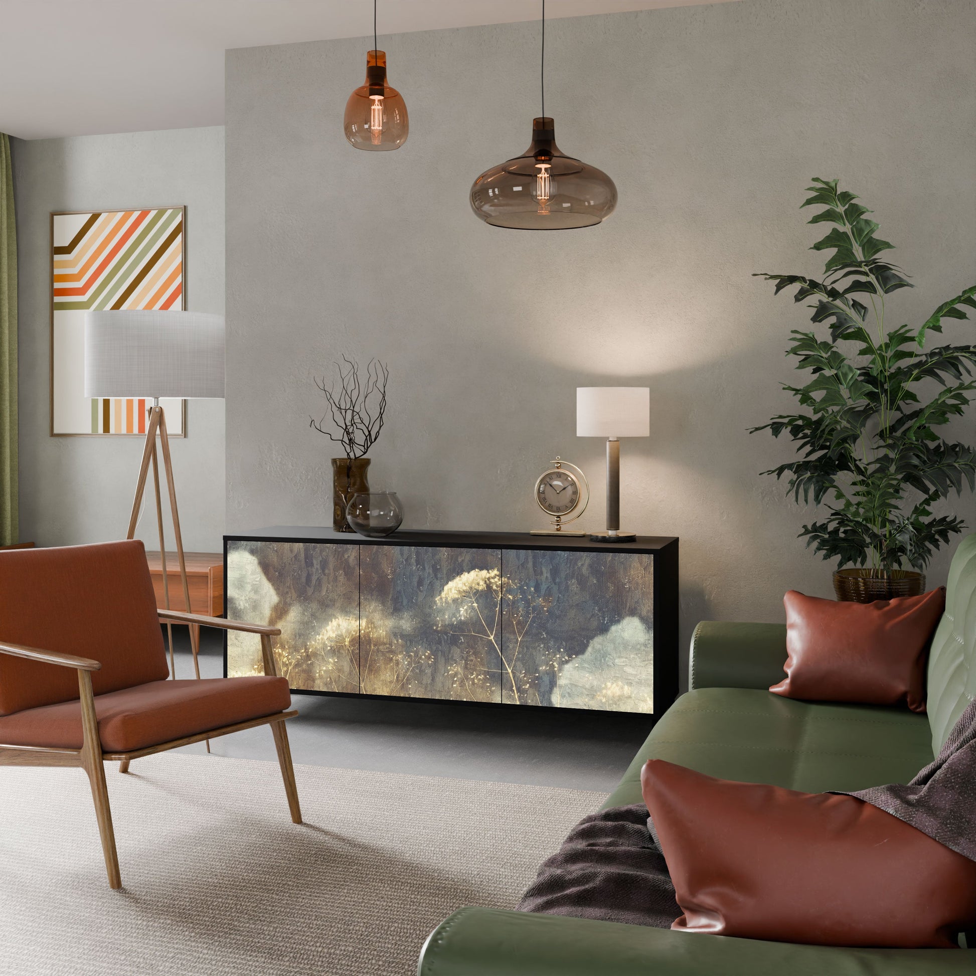 Elegance and functionality in a single piece of furniture – our 3-Door Sideboard with a black body is the perfect solution for lovers of stylish, modern interiors. The black body emphasizes the bold character of the furniture, while the fronts with a unique print add an artistic touch. It fits perfectly in the living room, bedroom, or office, complementing both modern and industrial arrangements.