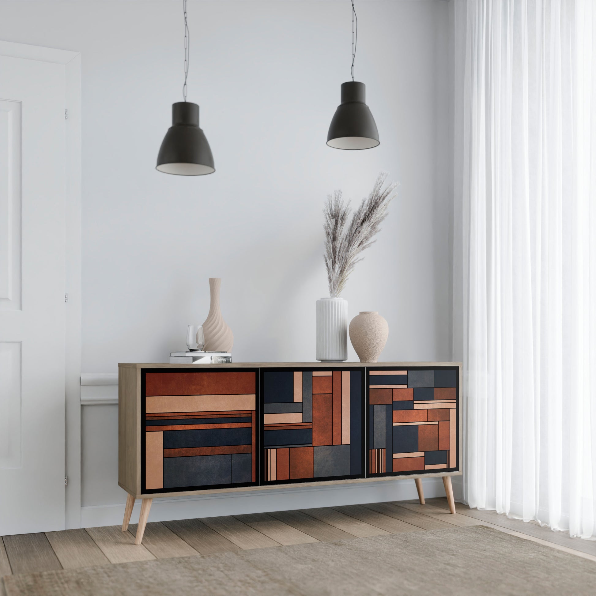 Discover the elegance and natural beauty of wood with our 3-door sideboard in oak finish. This stylish piece combines the sturdiness of a wooden body with the aesthetic detail of printed front doors, creating a cohesive and attractive design. Perfect for both the living room and bedroom, this sideboard adds a touch of class and functionality to any interior.