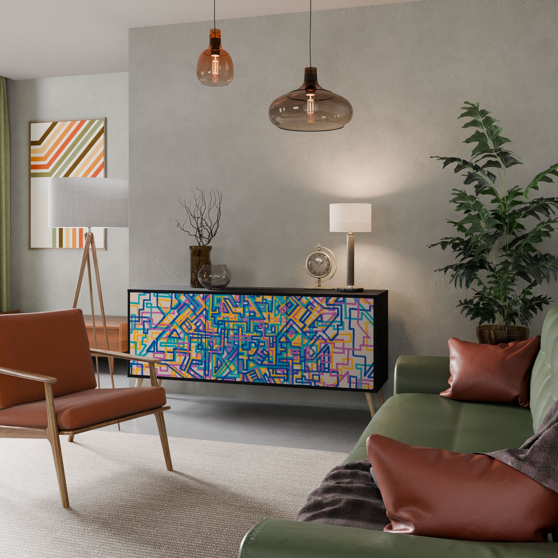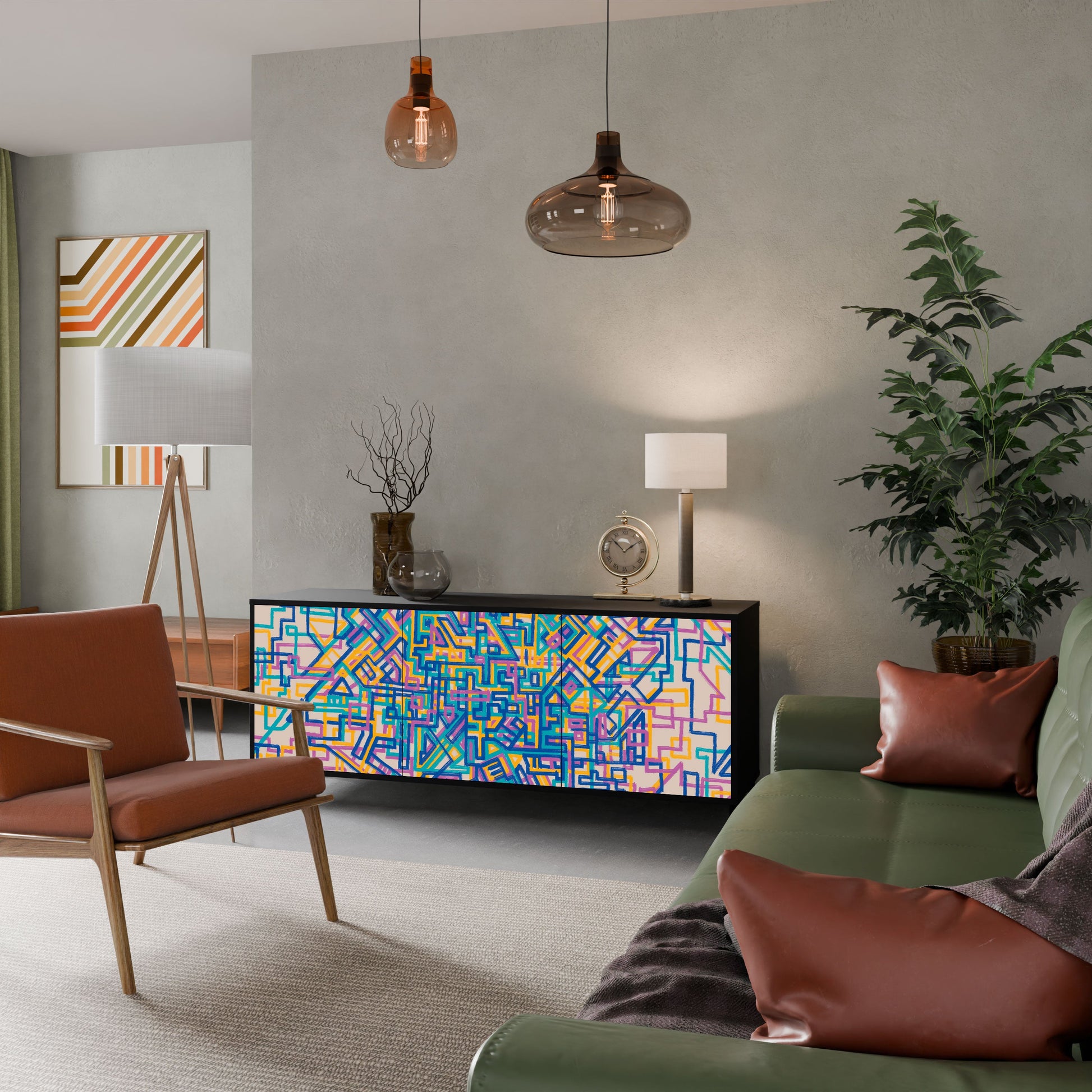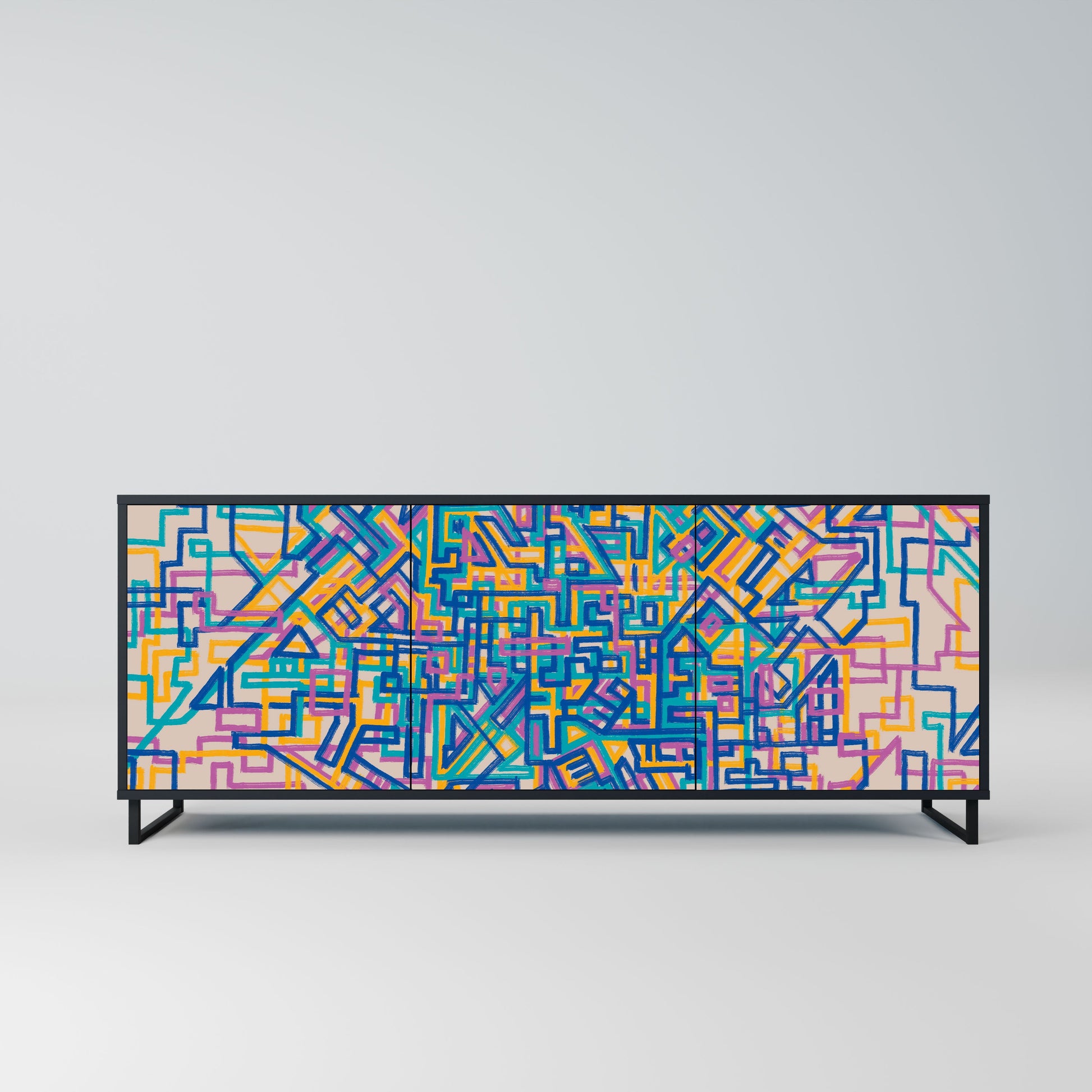 Elegance and functionality in a single piece of furniture – our 3-Door Sideboard with a black body is the perfect solution for lovers of stylish, modern interiors. The black body emphasizes the bold character of the furniture, while the fronts with a unique print add an artistic touch. It fits perfectly in the living room, bedroom, or office, complementing both modern and industrial arrangements.