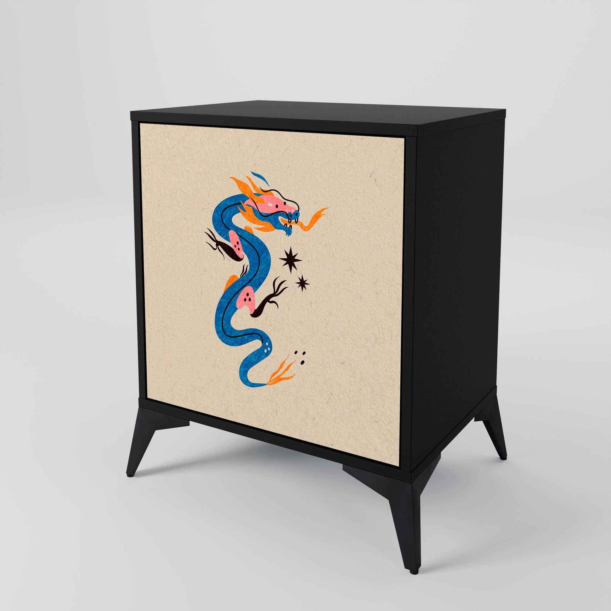 This compact yet remarkably elegant piece of furniture impresses with its minimalist design, perfectly fitting into both modern and classic interiors. The black body emphasizes the furniture’s bold character, while the fronts with a unique print add an artistic touch.