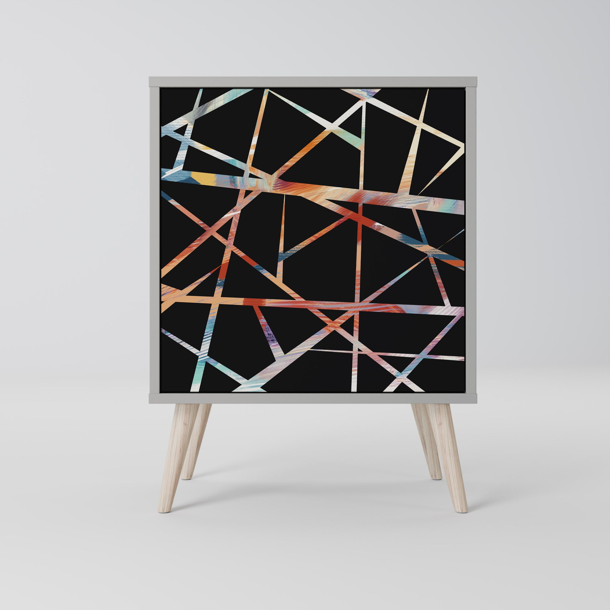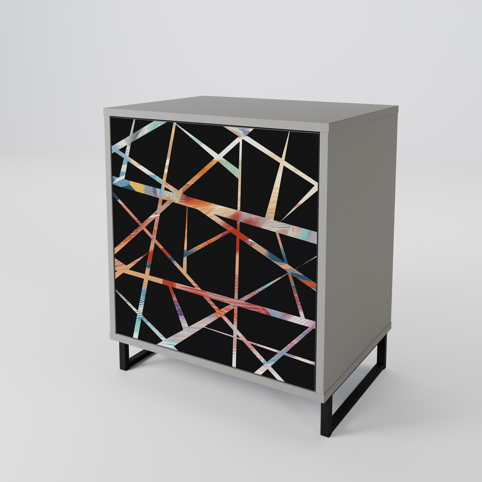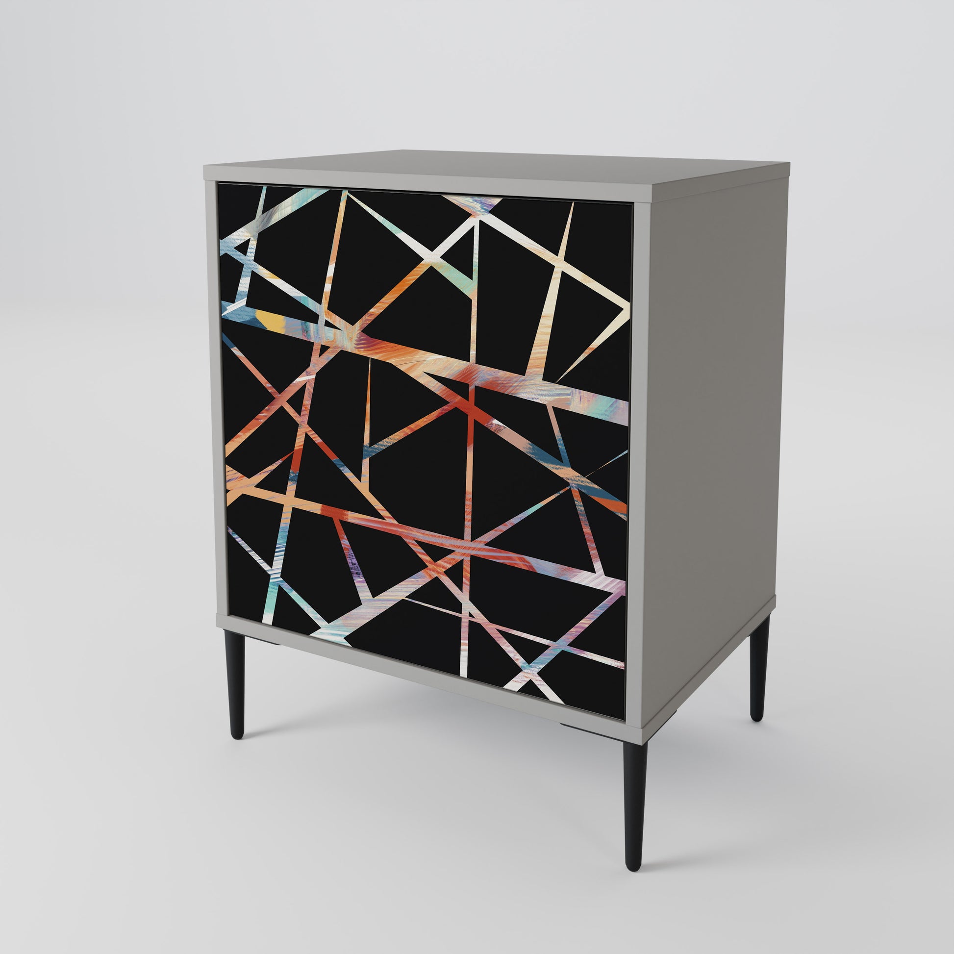 This compact yet remarkably elegant piece of furniture impresses with its minimalist design, perfectly fitting into both modern and classic interiors. The subdued grey color of the body gives the furniture a subtle yet distinctive character, while the fronts with a unique print add an artistic touch.