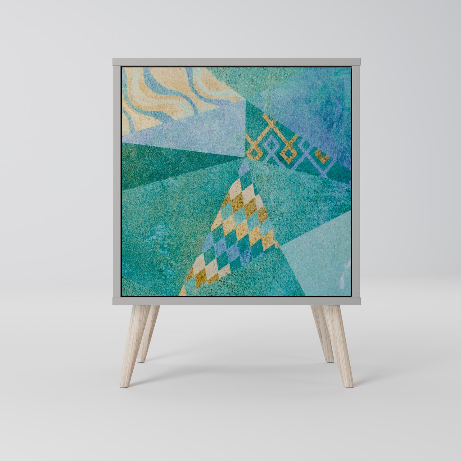 This compact yet remarkably elegant piece of furniture impresses with its minimalist design, perfectly fitting into both modern and classic interiors. The subdued grey color of the body gives the furniture a subtle yet distinctive character, while the fronts with a unique print add an artistic touch.