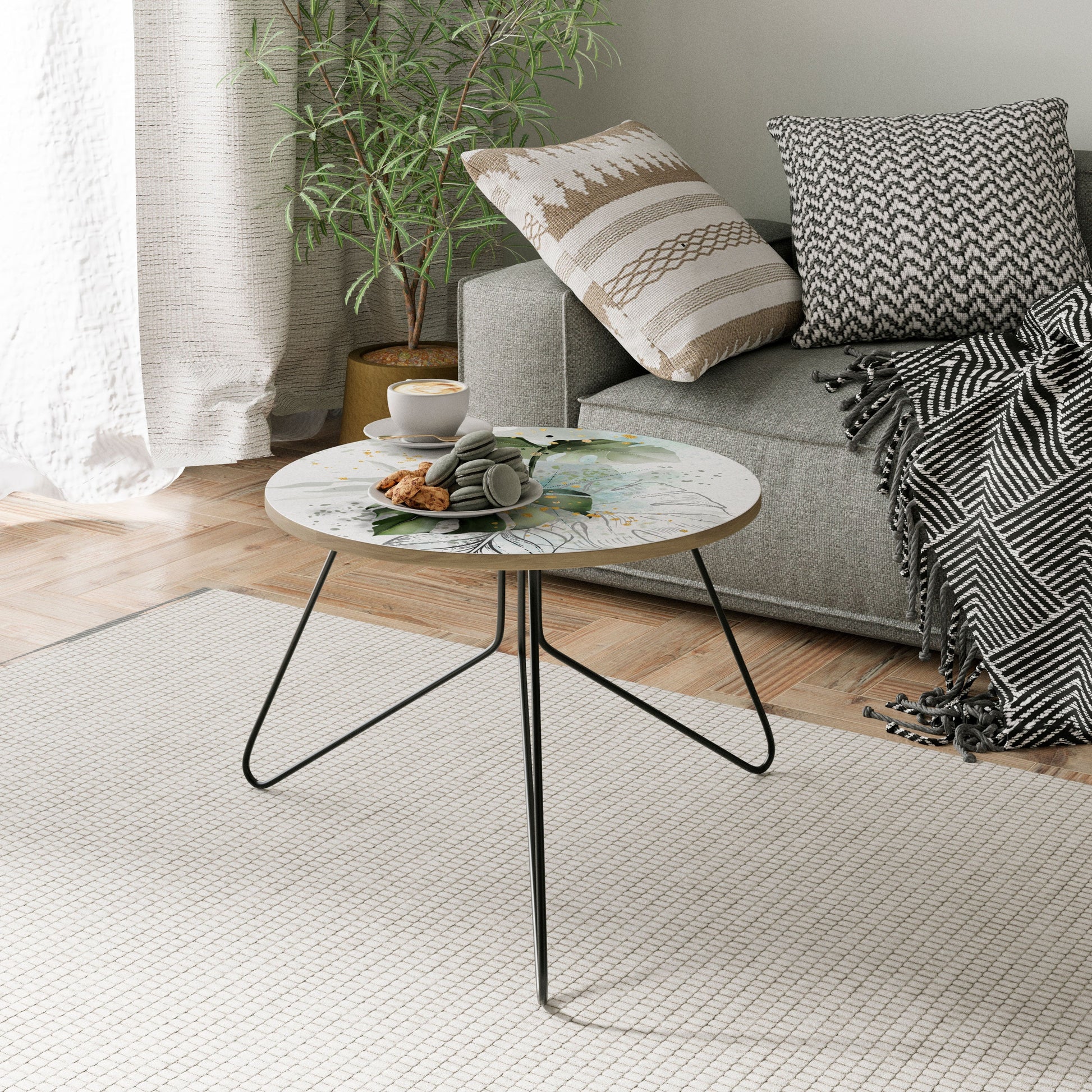 The tabletop features a high-quality printed motif, adding a distinctive artistic accent to your space. Crafted from durable chipboard covered with laminate, it ensures long-lasting use and resistance to daily wear.