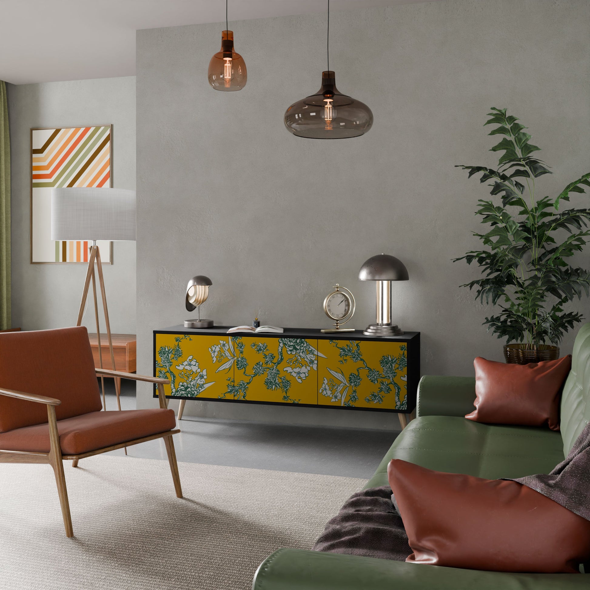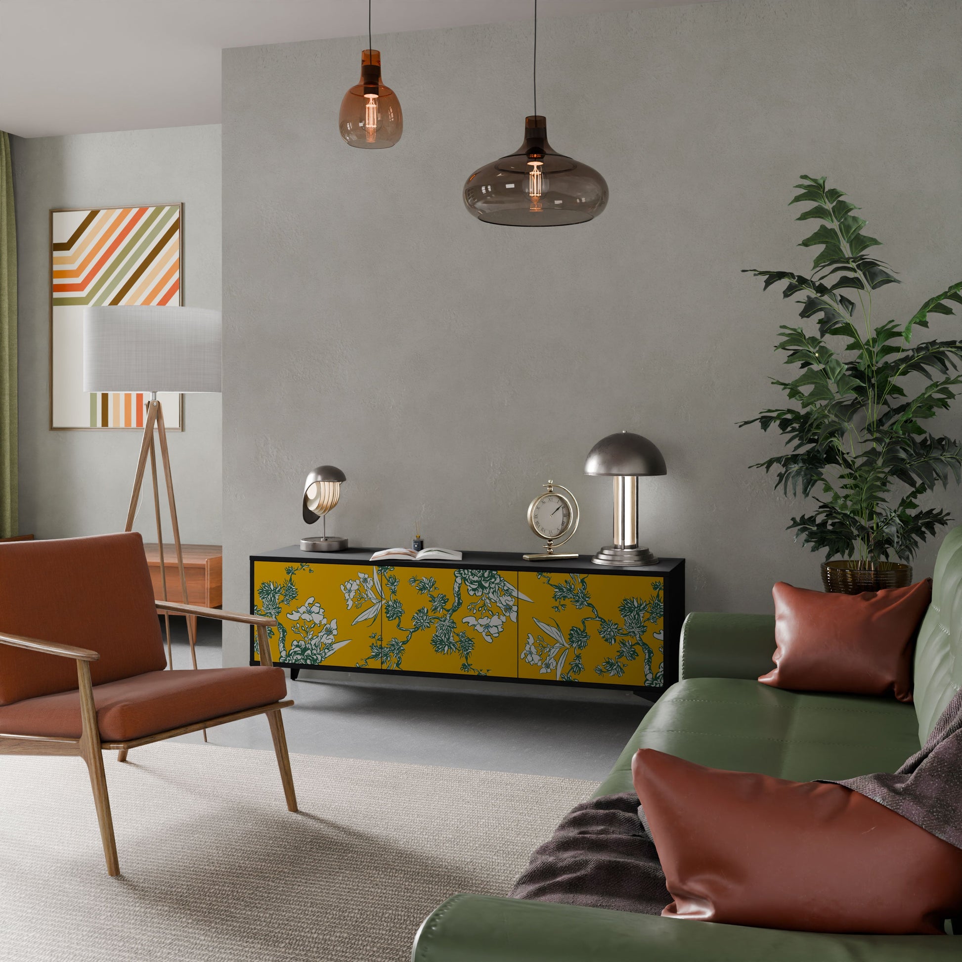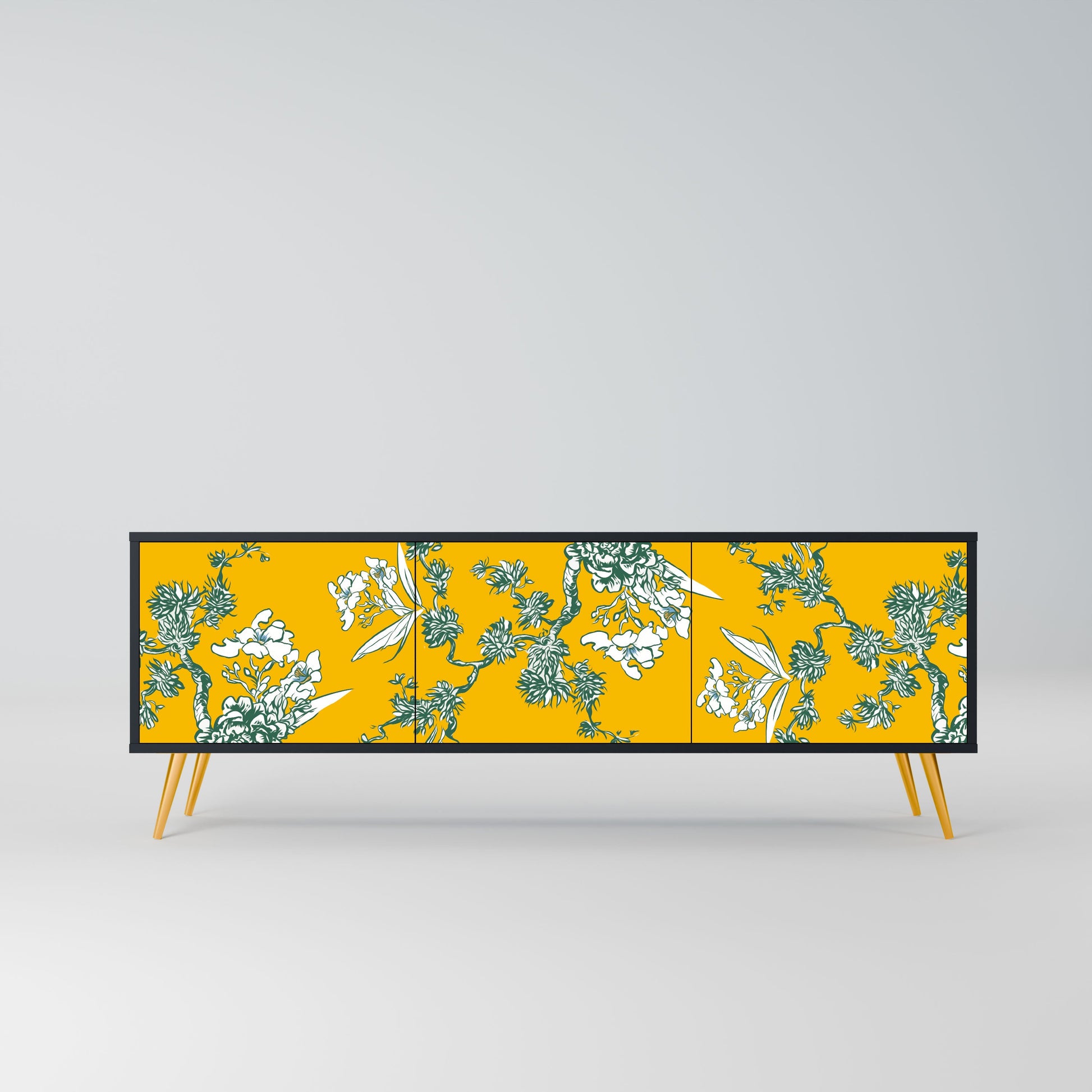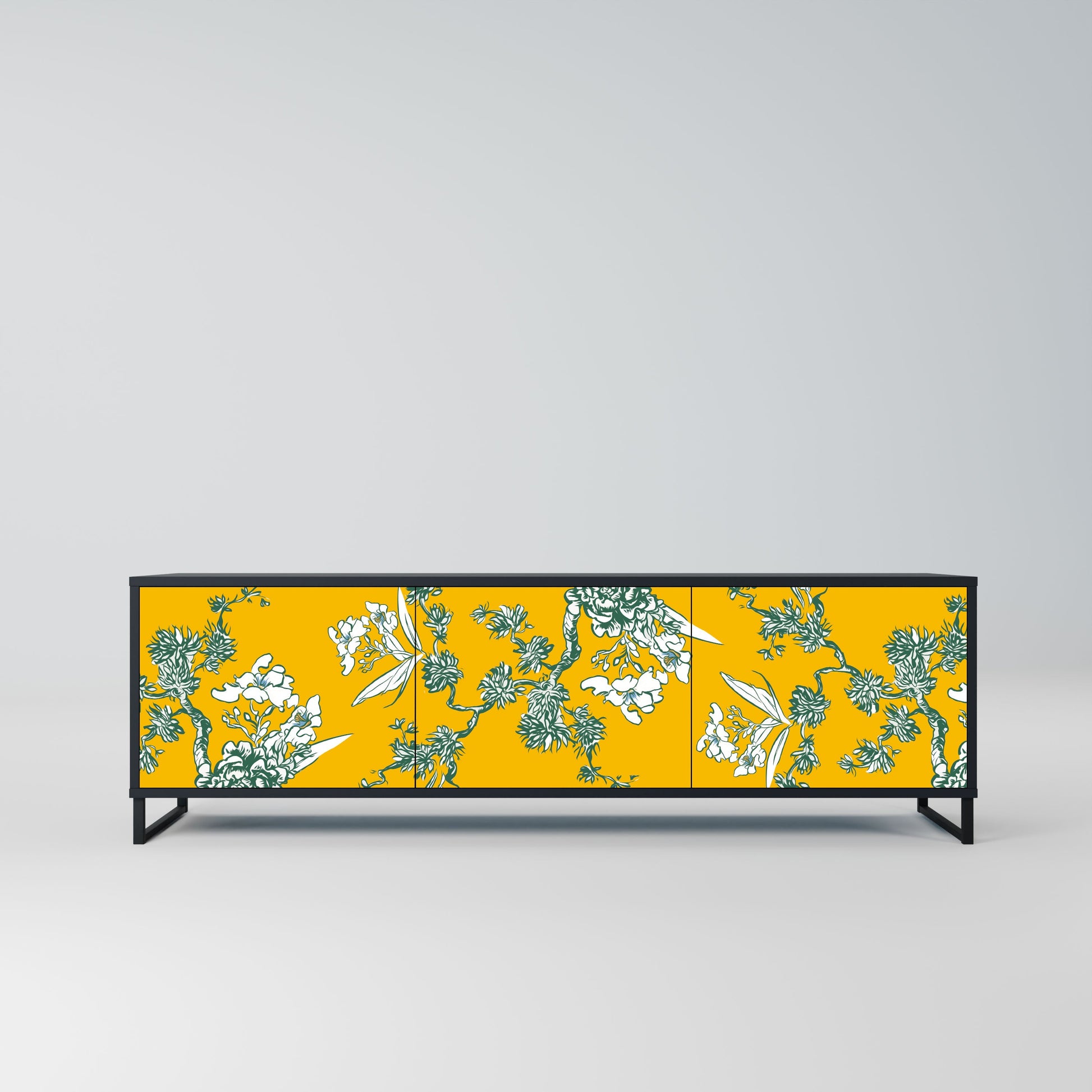 YELLOW CHINOISERIE 3-Door TV Stand in Black Finish